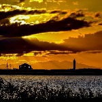 オロロンライン サロベツ原野からみた、利尻に沈む夕日