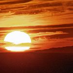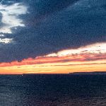 > 佐渡海峡に沈む太陽と日没直後に灯るいさり火