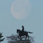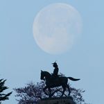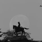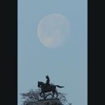 説明 夜明けの沈むお月さまと青菜城址の伊達政宗騎馬像とのコラボレーション 青葉神社ののぼりのイメージで。